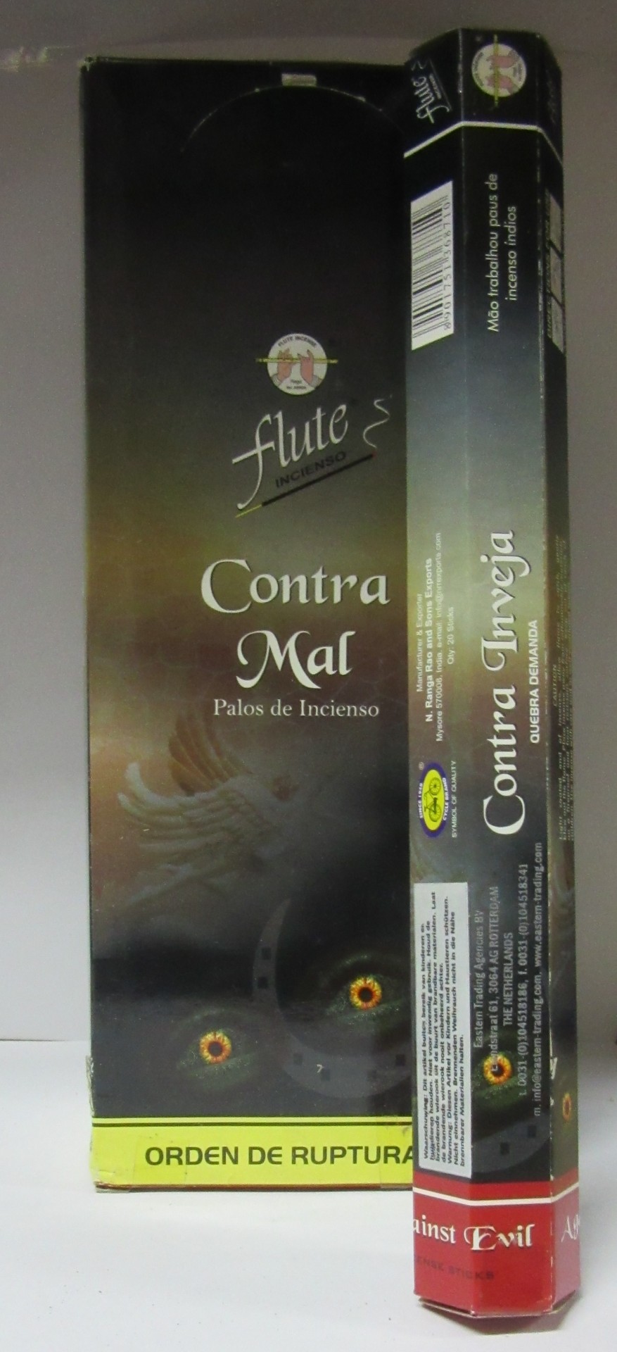 Embalagem de incenso Flute Contra Mal com olhos amarelos e texto em várias línguas