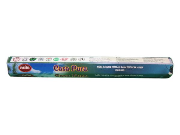 Embalagem azul de incenso Casa Pura com texto e símbolos ecológicos.