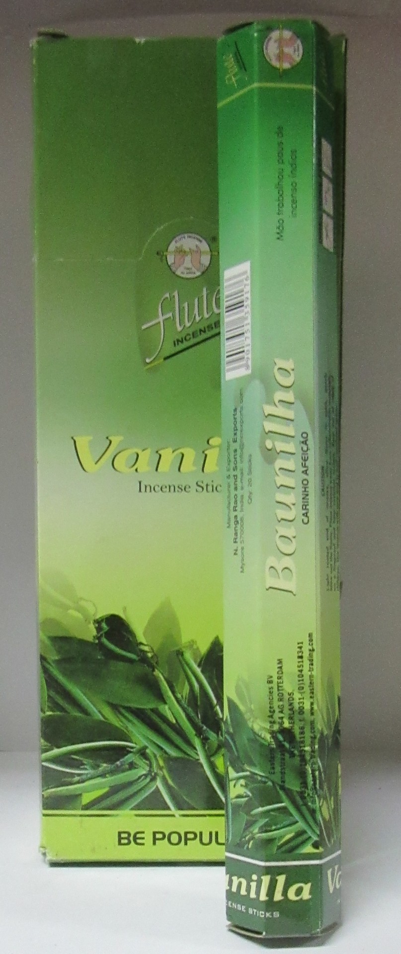 Embalagem verde com palitos de incenso de baunilha e texto em português