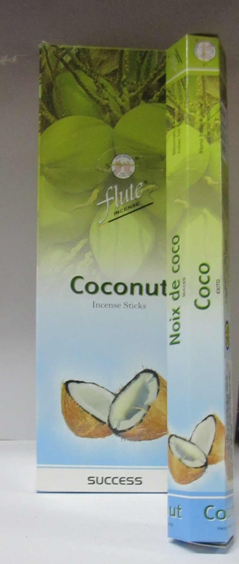 Embalagem de palitos de incenso aroma coco com imagem de cocos e texto em inglês, francês e espanhol.