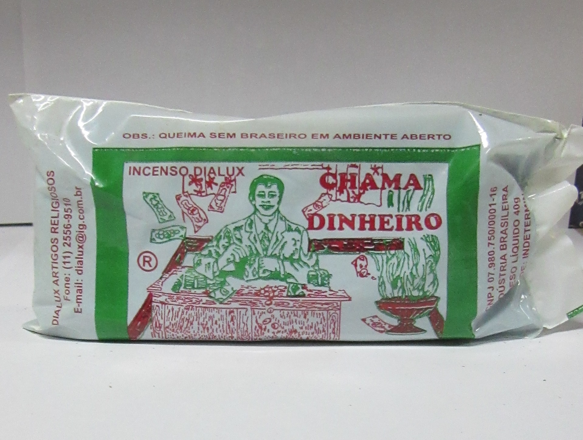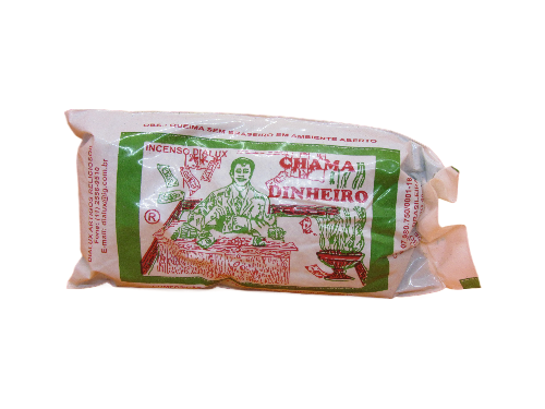 Pacote de incenso CHAMA DINHEIRO com imagem de homem e texto em verde e vermelho