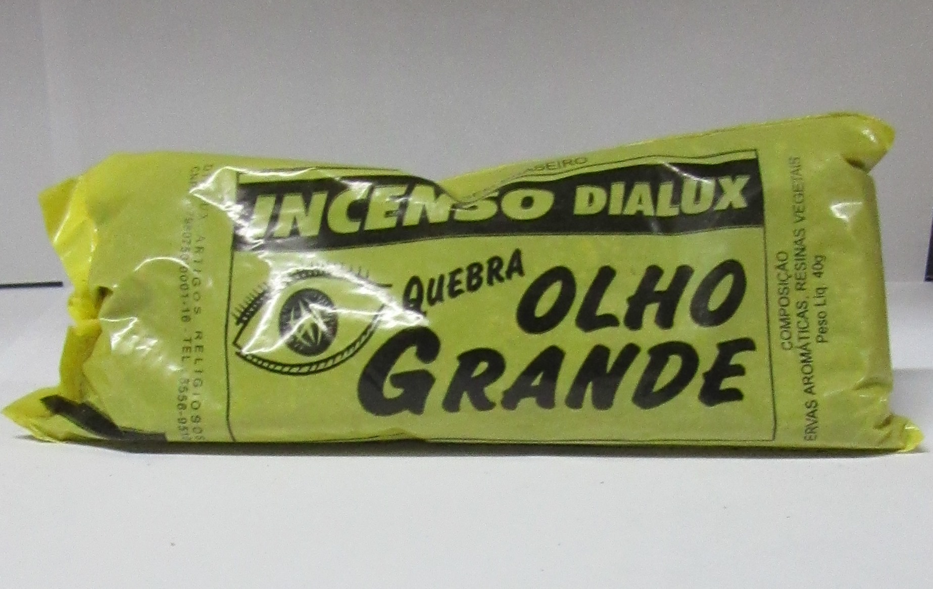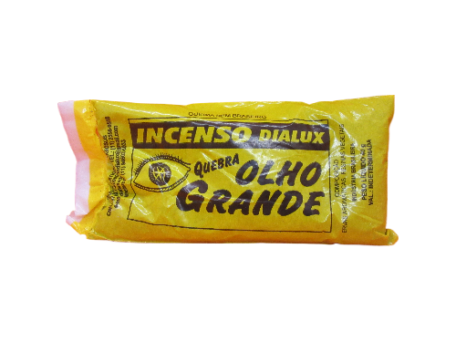 Pacote amarelo de incenso DIALUX com texto preto e desenho de olho