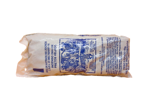 Pacote branco de plástico com texto azul e ilustração de duas figuras sentadas, contendo incenso Dialux Pretos Velhos.