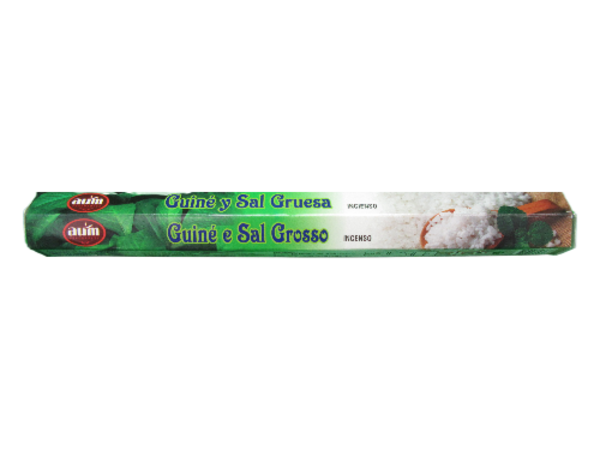 Embalagem de incenso verde com texto em castelhano e português e imagem de sal grosso