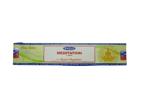 Embalagem de incenso Satya Yoga Meditation com ilustração de pessoa a meditar