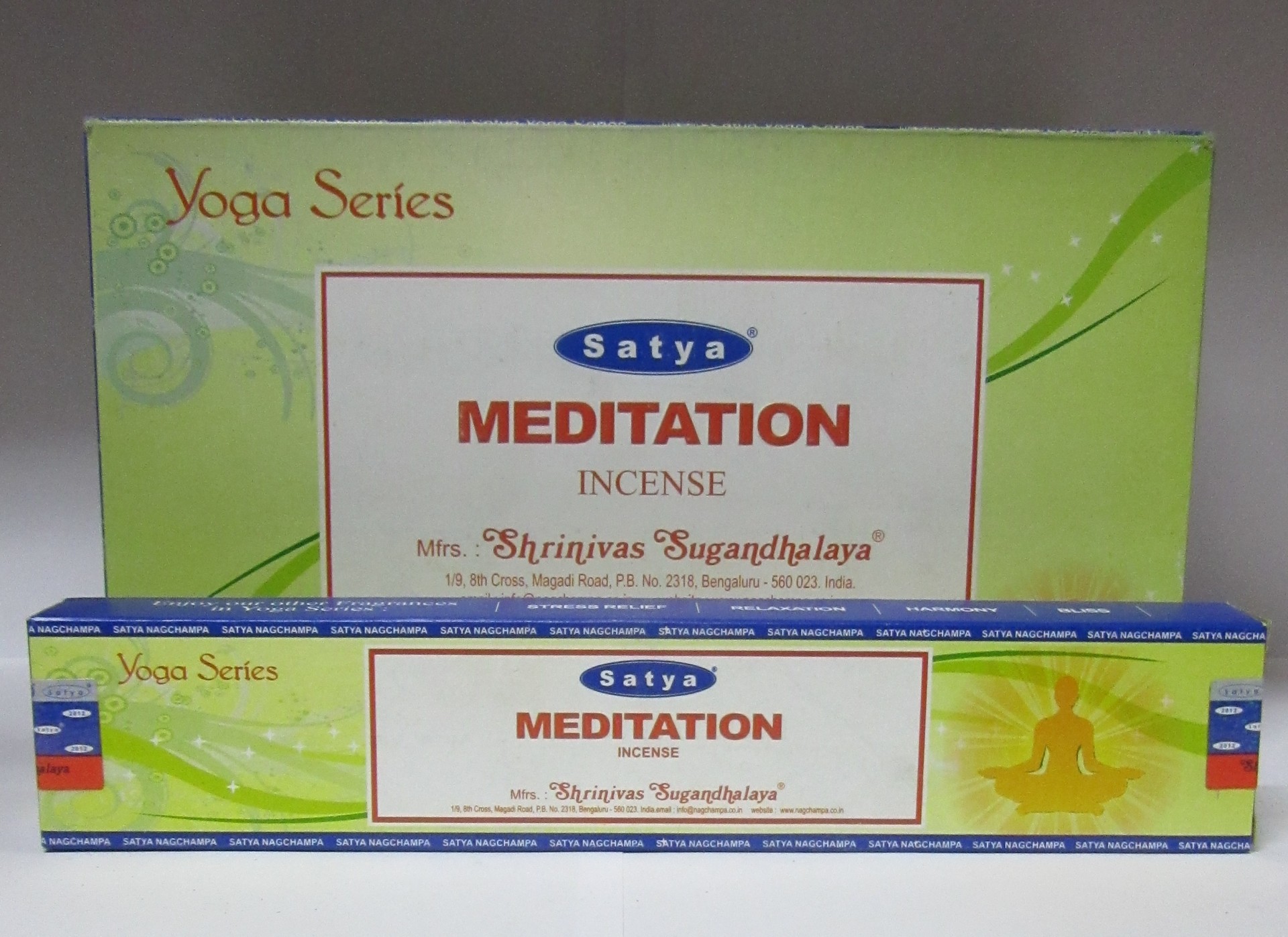 Caixa e embalagem verde e amarelo de incenso Satya Meditation série Yoga com texto em inglês.