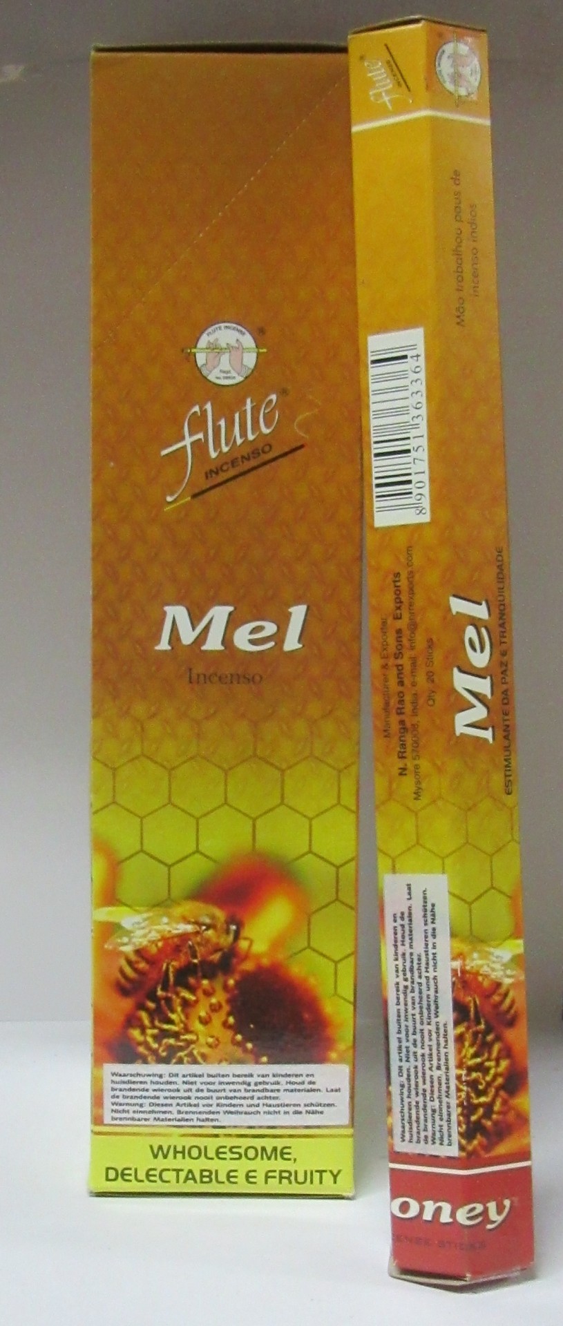 Embalagem de incenso Flute Mel com imagem de abelhas sobre fundo de colmeia laranja e amarelo