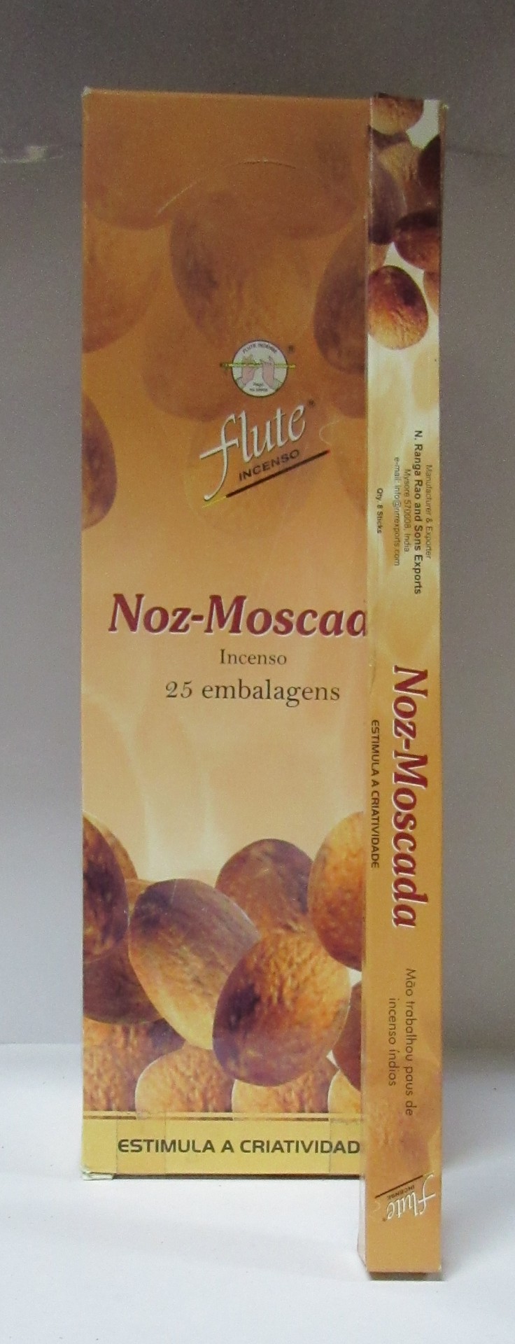 Caixa amarela de incenso Flute Noz-Moscada com 25 embalagens, imagens de noz-moscada e texto em português.