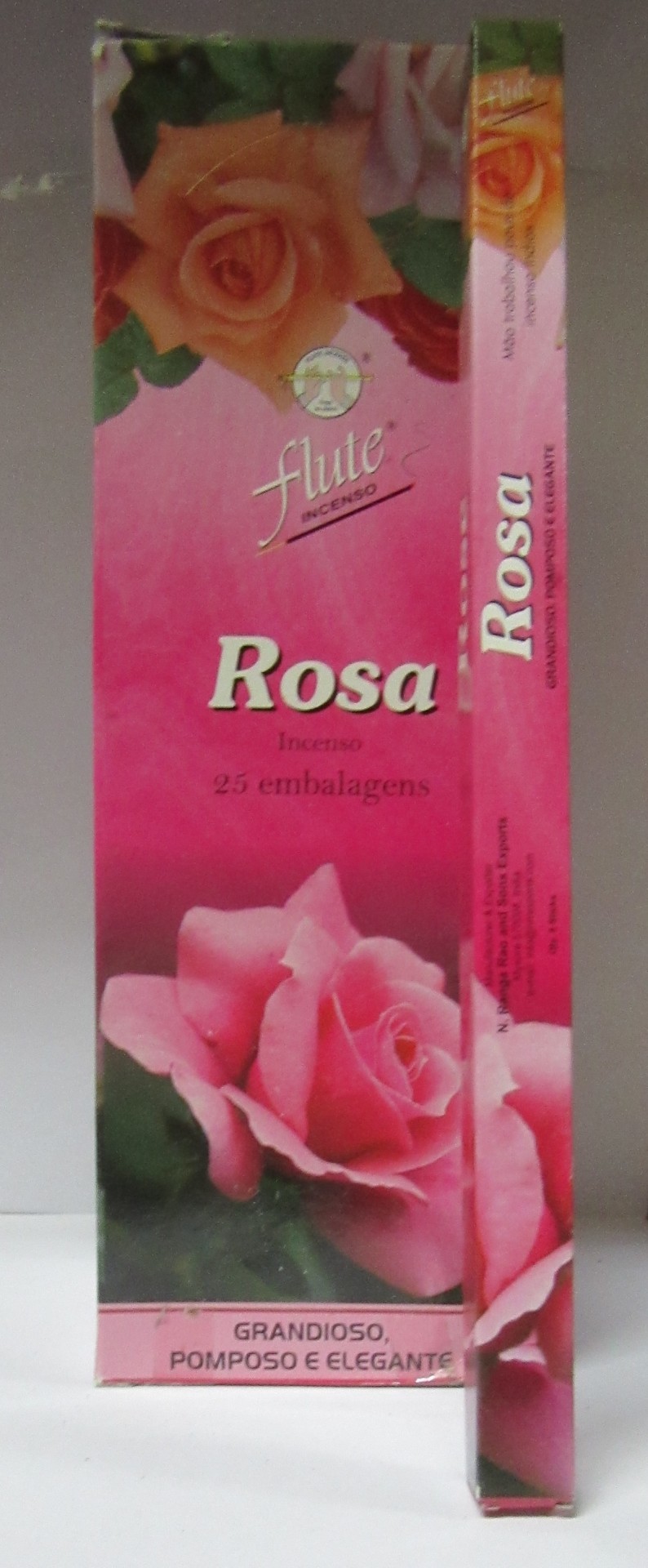 Embalagem de incenso rosa com imagens de rosas e texto em português.