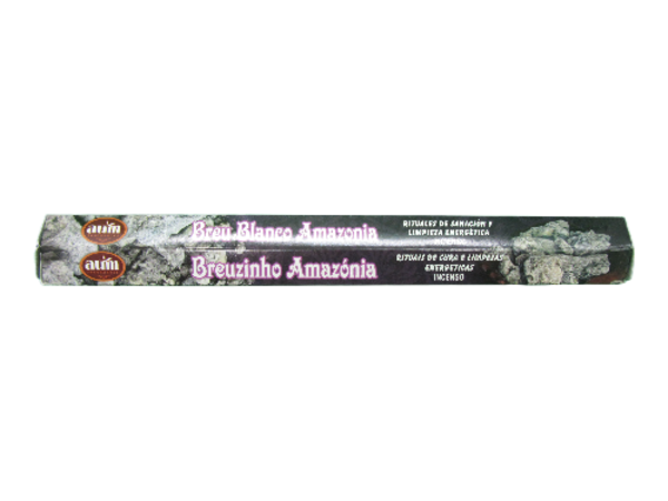 Pacotes de incenso Breuzinho Amazónia preto com texto e imagens de pedras ambarinas