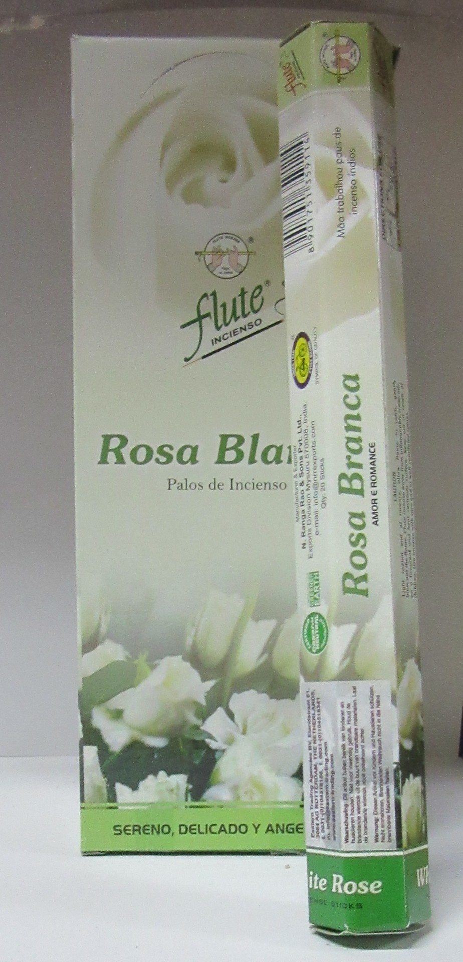 Caixa e embalagem de incenso Flute Rosa Blanca com flores brancas e textos em português e espanhol.