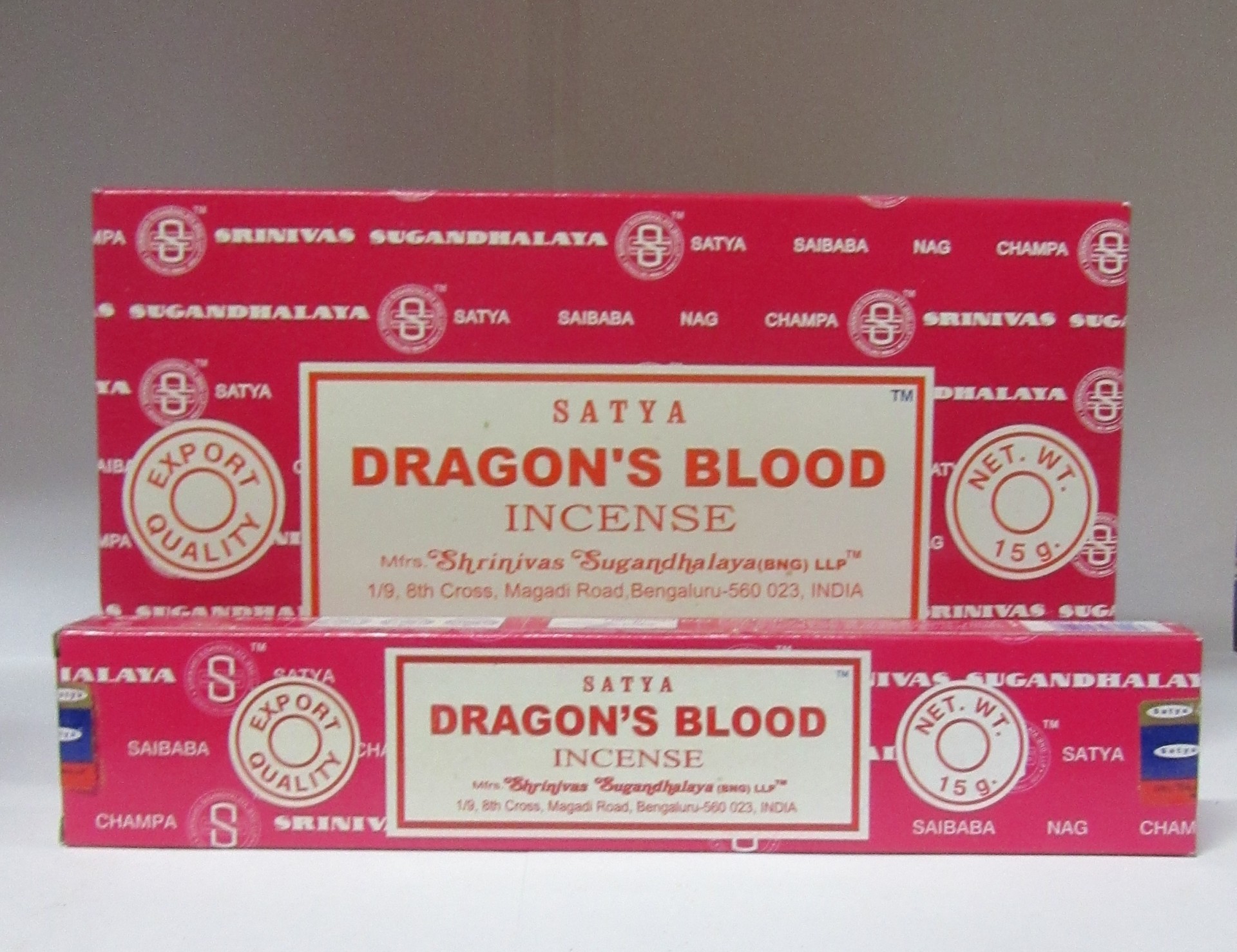 Caixas de incenso Satya Dragon's Blood vermelhas e brancas com texto em inglês, sobre fundo cinza.