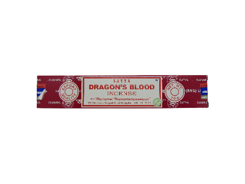 Caixa de incenso Satya Dragon's Blood vermelha com texto branco e vermelho.