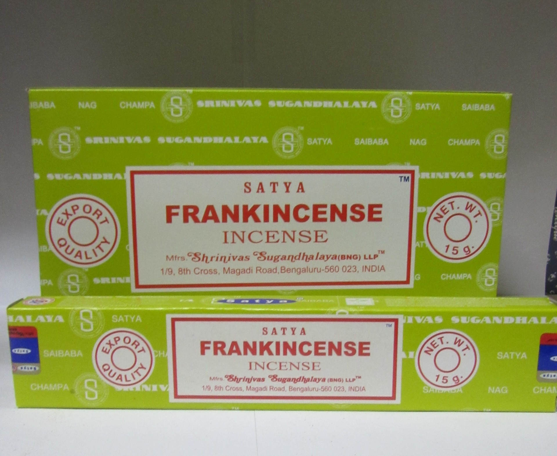 Caixas verdes de incenso Satya Frankincense com texto e peso visíveis