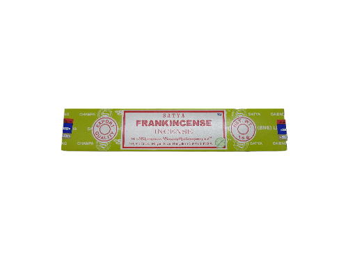 Embalagem de incenso Satya Frankincense verde com texto e selo