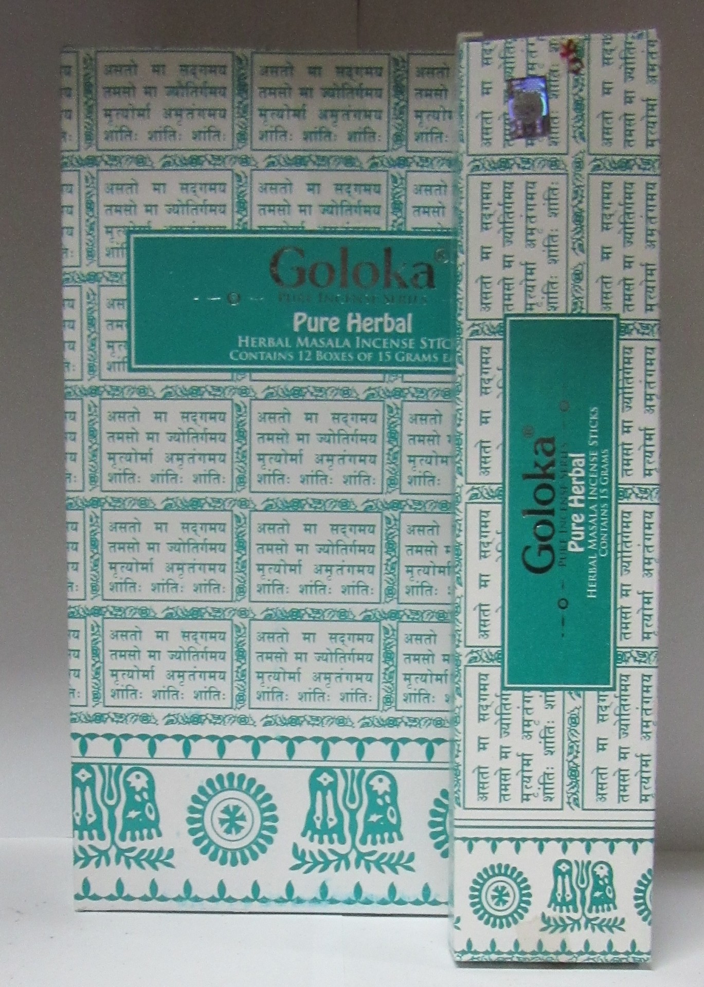 Caixa e pacote de incenso Goloka Pure Herbal com padrões decorativos verdes e texto em inglês e hindi.