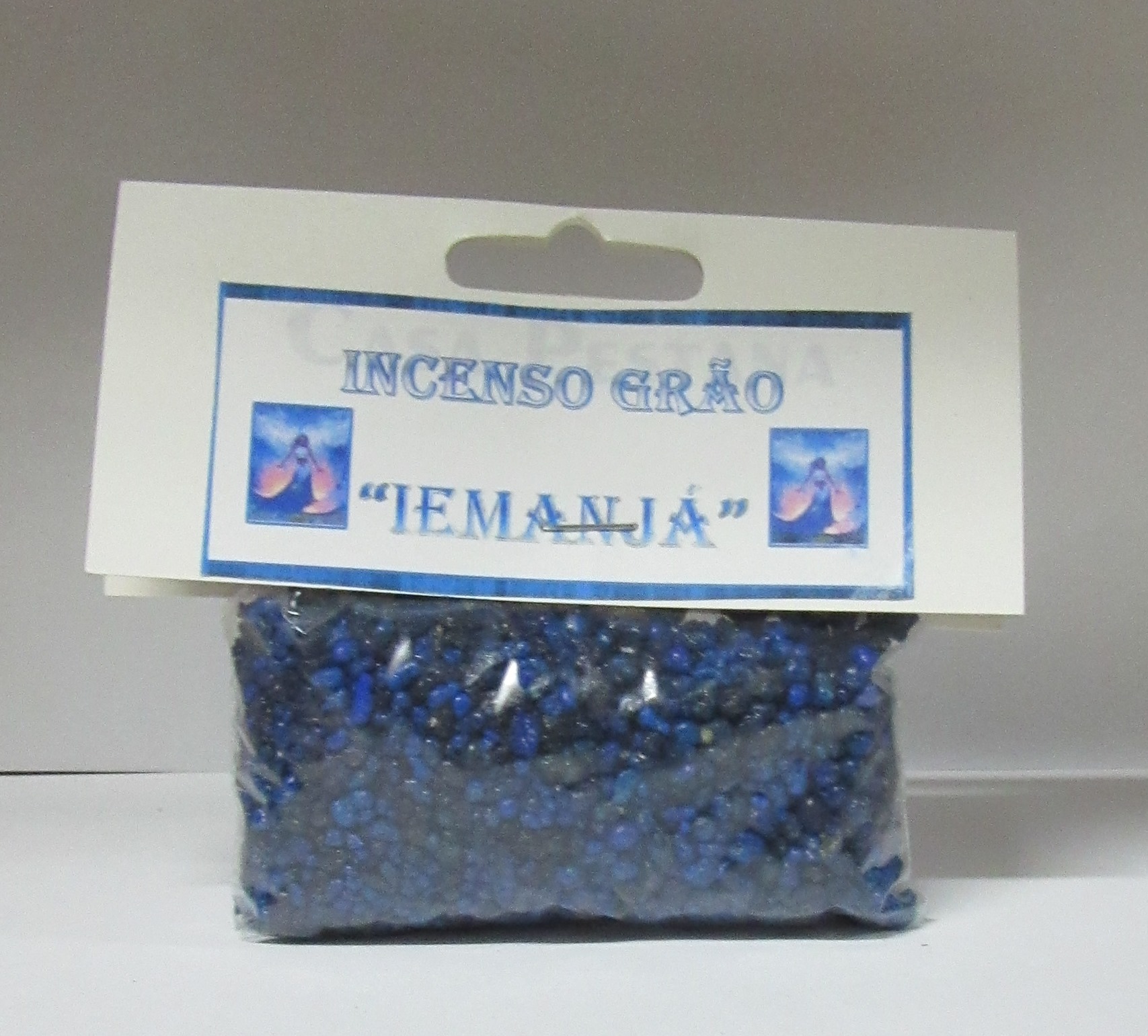 Pacote de incenso em grão com rótulo 'INCENSO GRÃO IEMANJÁ' e imagens pequenas azuis.