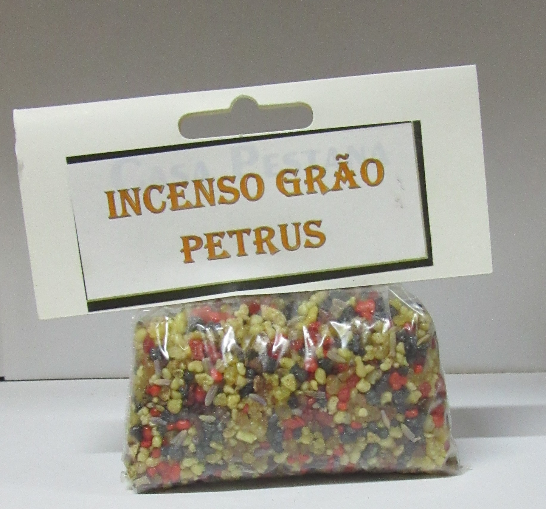 Pacote de incenso grão PETRUS com grãos coloridos e etiqueta branca.