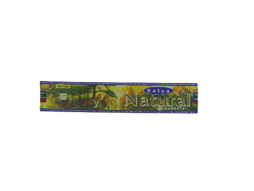 Embalagem de incenso Satya Natural AGARBATTI com design verde e amarelo e ilustração de natureza