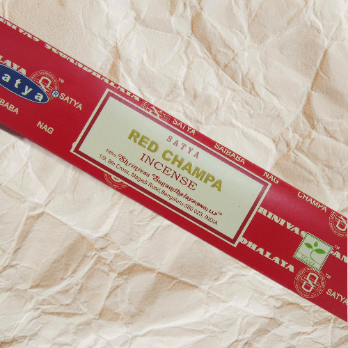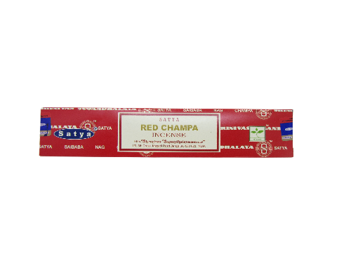 Incenso Satya Red Champa em embalagem vermelha com texto