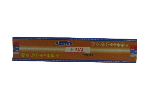 Embalagens de incenso Satya Ritual laranja com texto e símbolos religiosos.