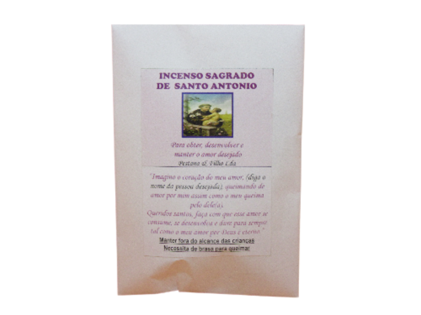 Pacote de incenso de Santo António com etiqueta e texto em português