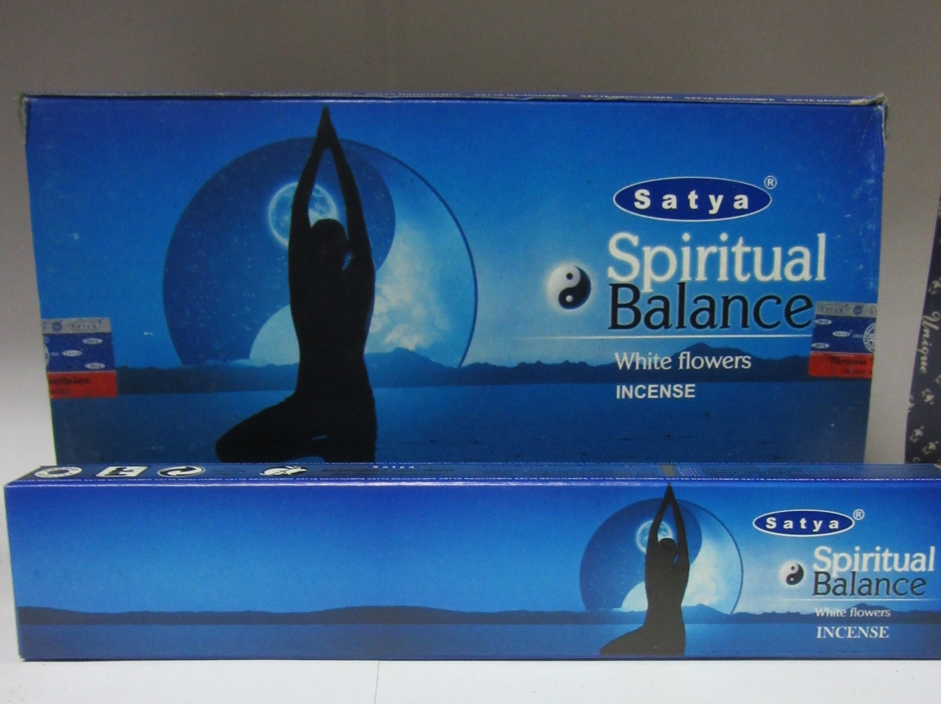 Embalagem azul de incenso Satya Spiritual Balance com figura em meditação.