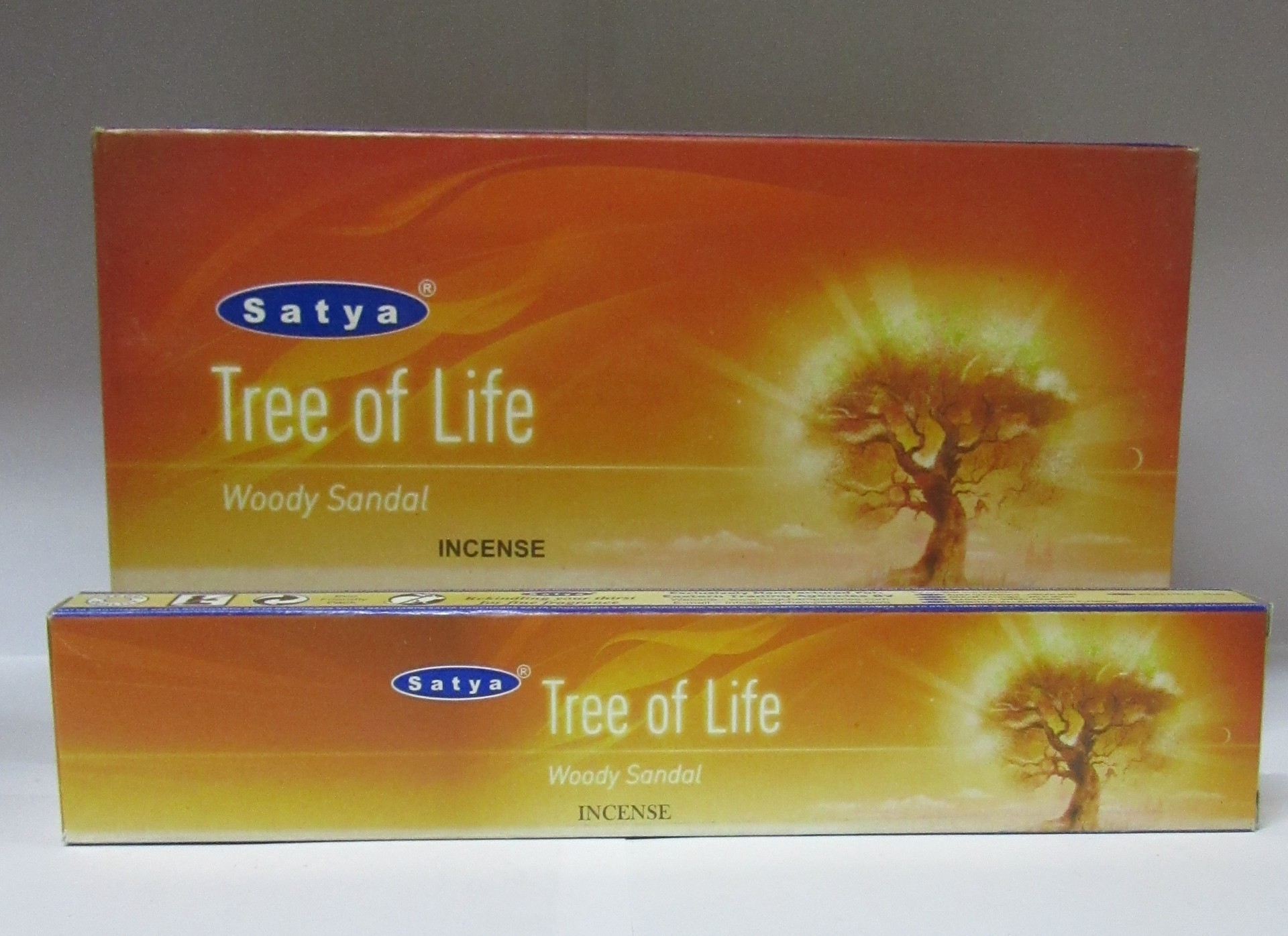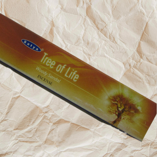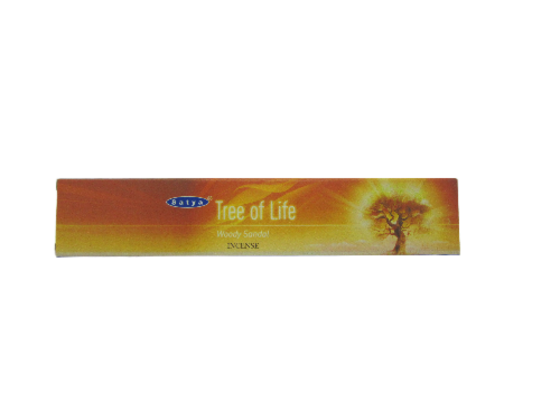 Caixa de incenso Satya Tree of Life com imagem de árvore e fundo castanho e amarelo