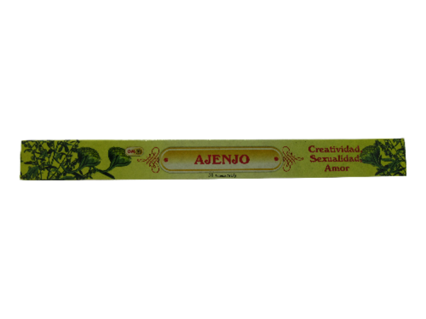 Embalagem de incenso amarelo com texto AJENJO e folhas verdes.