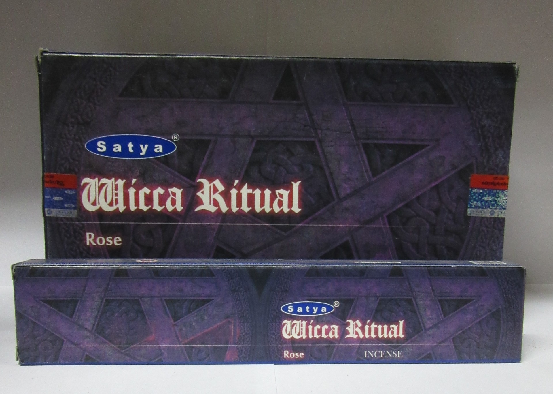 Caixa e pacote de incenso Satya Wicca Ritual Rose em tons de roxo com texto e padrão de estrela.