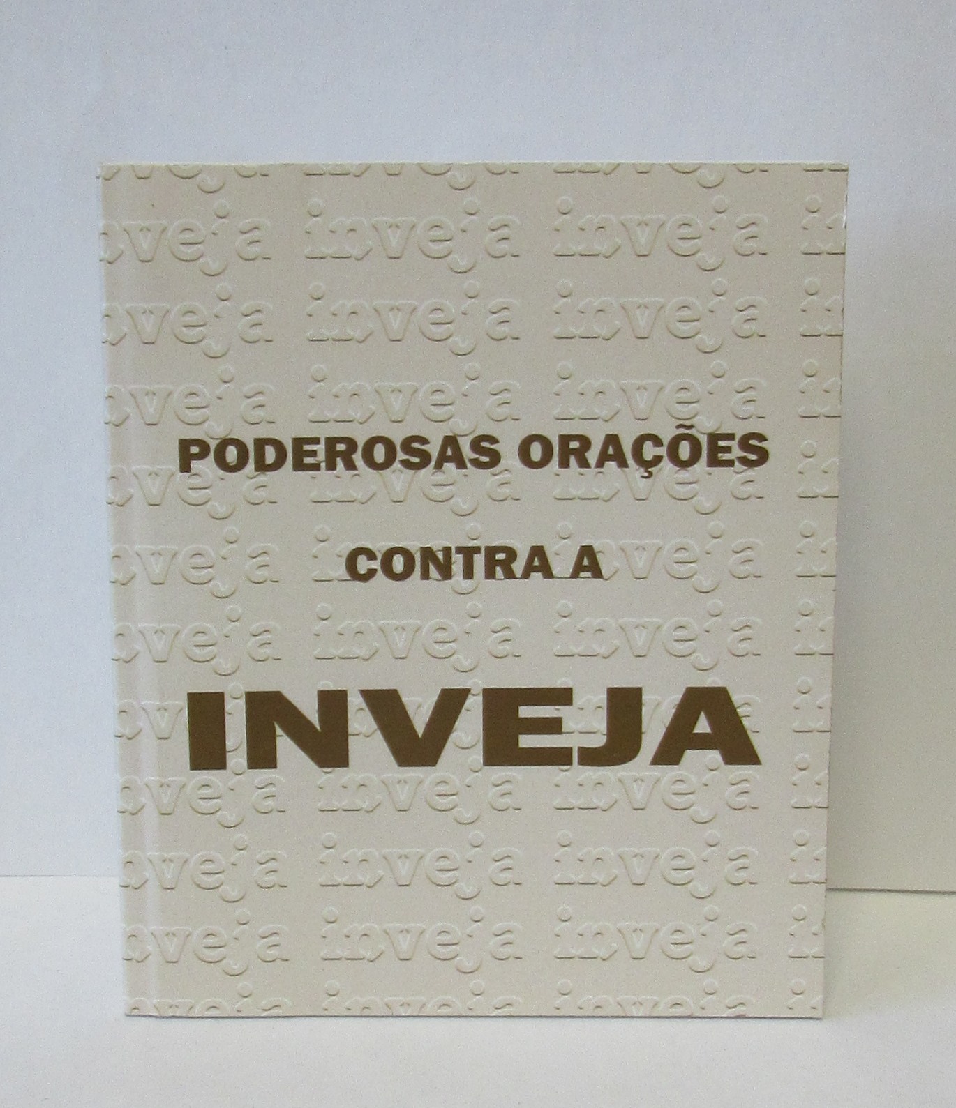 Caixa branca com relevo e texto em dourado 'PODEROSAS ORAÇÕES CONTRA A INVEJA'