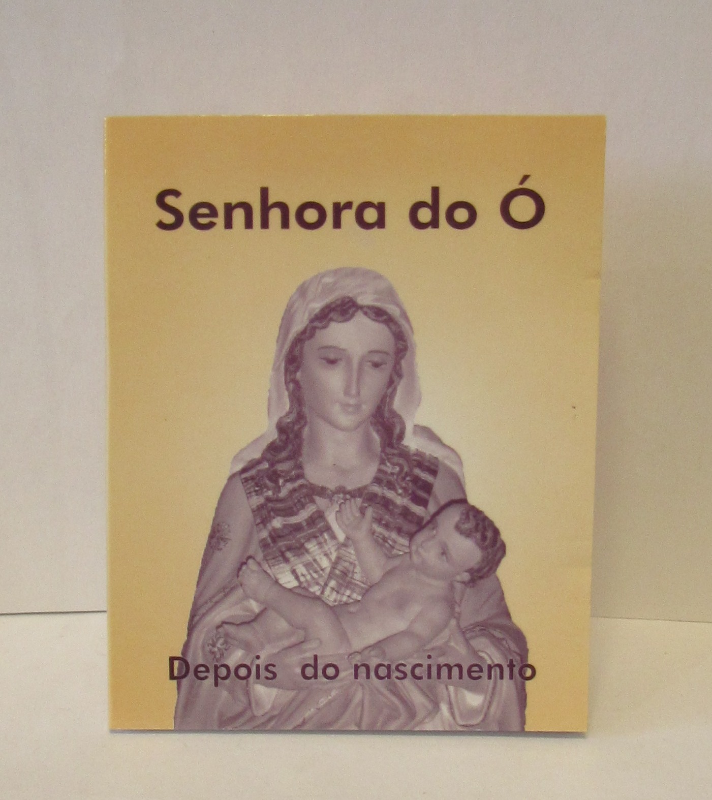 Capa de livro amarela com estátua monocromática de Senhora do Ó segurando bebé e textos 'Senhora do Ó' e 'Depois do nascimento'