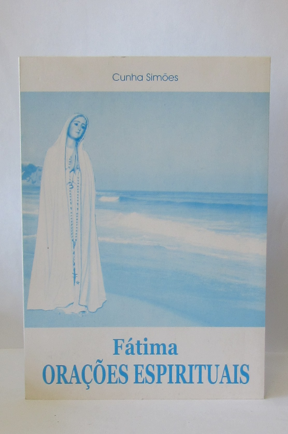 Capa de livro 'Fátima Orações Espirituais' com imagem de figura feminina vestida de branco e mar ao fundo.