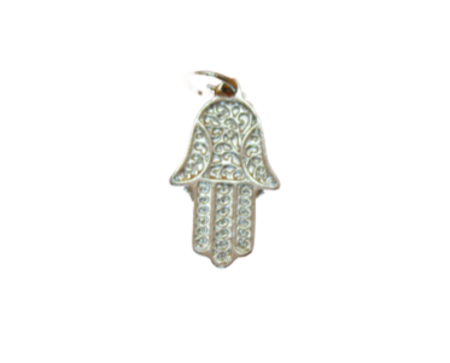 Pendente em forma de mão da fatima prateado com arabescos