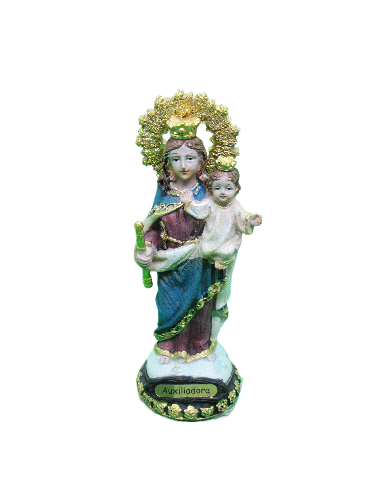 A descrição da imagem de Nossa Senhora Auxiliadora e do Menino Jesus é repleta de simbolismos, como a coroa que representa a realeza e o poder de intercessão, o manto azul que simboliza a origem celestial e a verdade, e a túnica vermelha que representa o sangue de Cristo e sua paixão. Além disso, a imagem é vista como protetora dos lares e invocada nas dificuldades familiares e catástrofes.