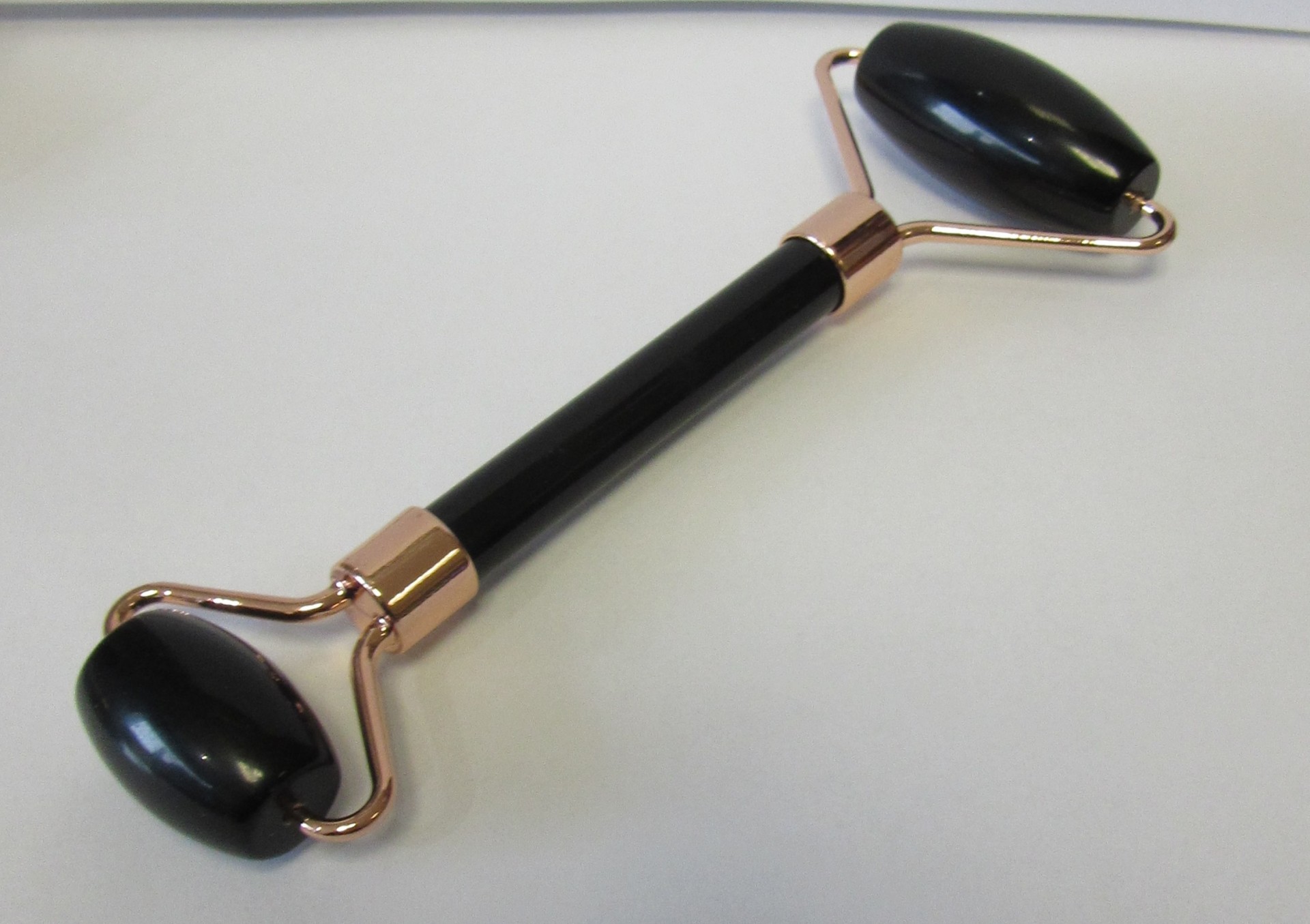 Rolo de massagem facial preto com armação dourada sobre fundo branco