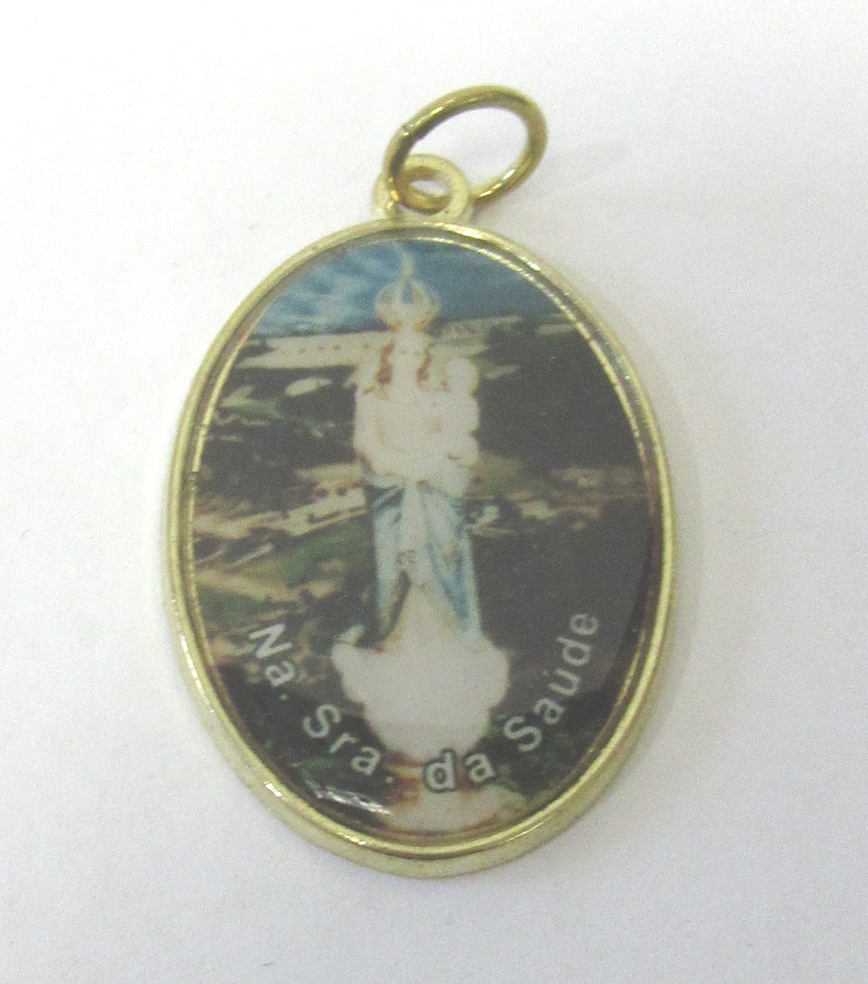 Medalha oval dourada com imagem de Nossa Senhora da Saúde e texto