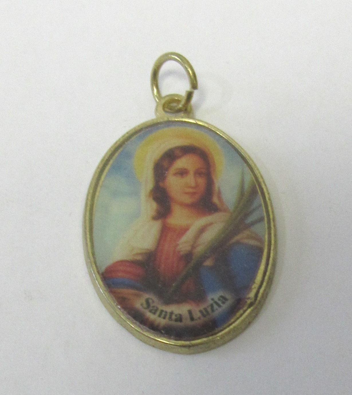 Medalha oval de Santa Luzia com imagem colorida e texto
