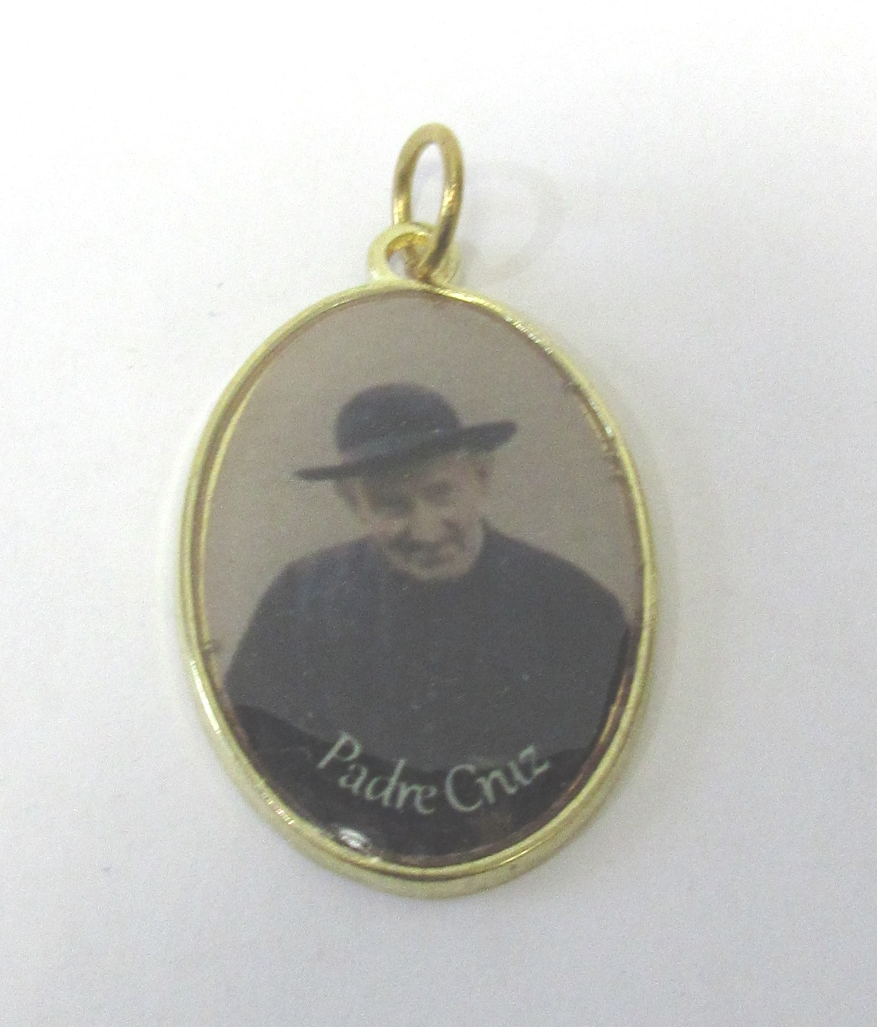 Medalha oval dourada com imagem de um homem e texto Padre Cruz