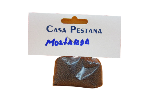 Pacote transparente com sementes de mostarda e etiqueta branca Casa Pestana Mostarda