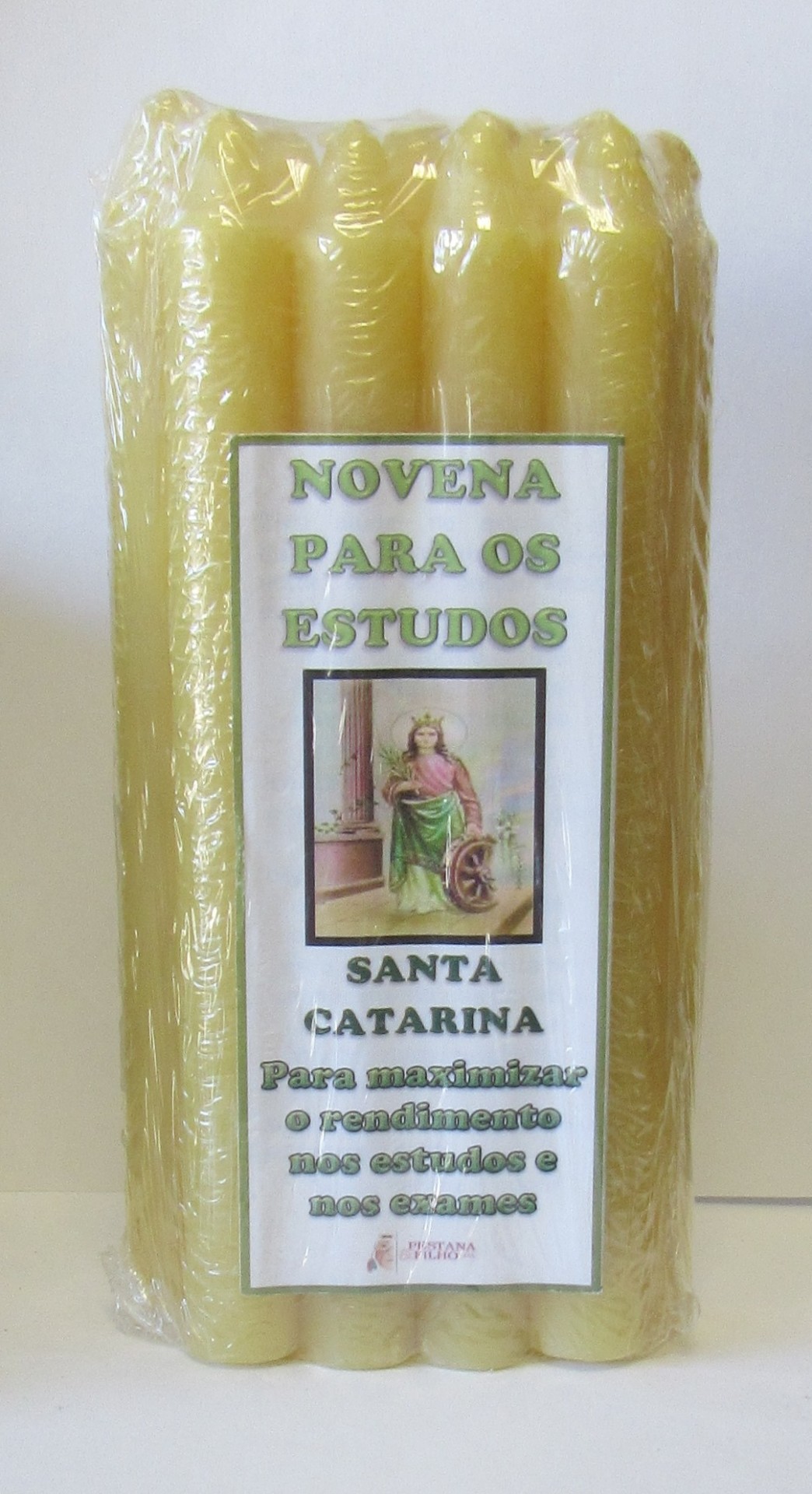 Pacote de velas amarelas com rótulo e imagem de Santa Catarina