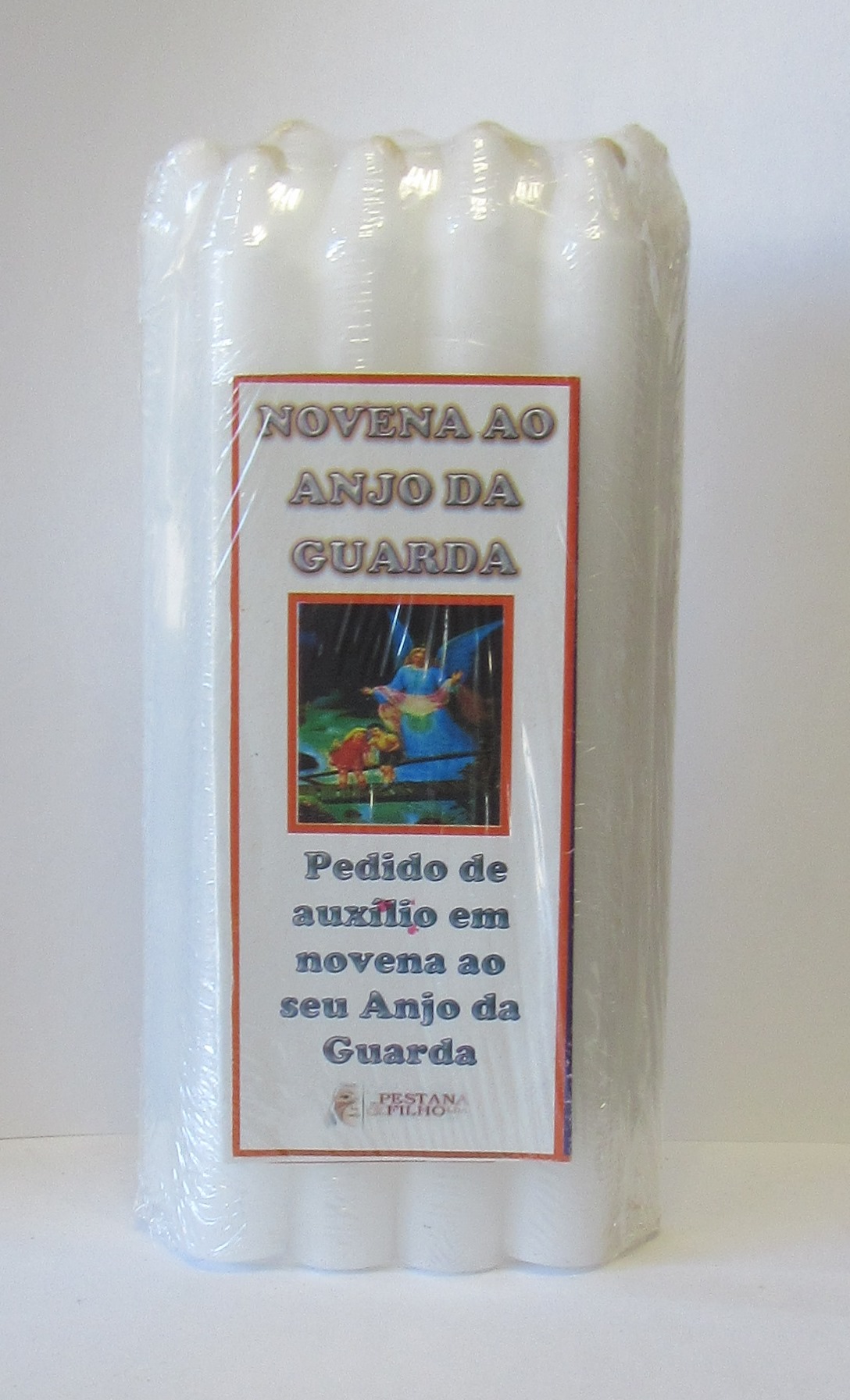 Pacote com nove velas brancas e rótulo com texto e imagem de anjo