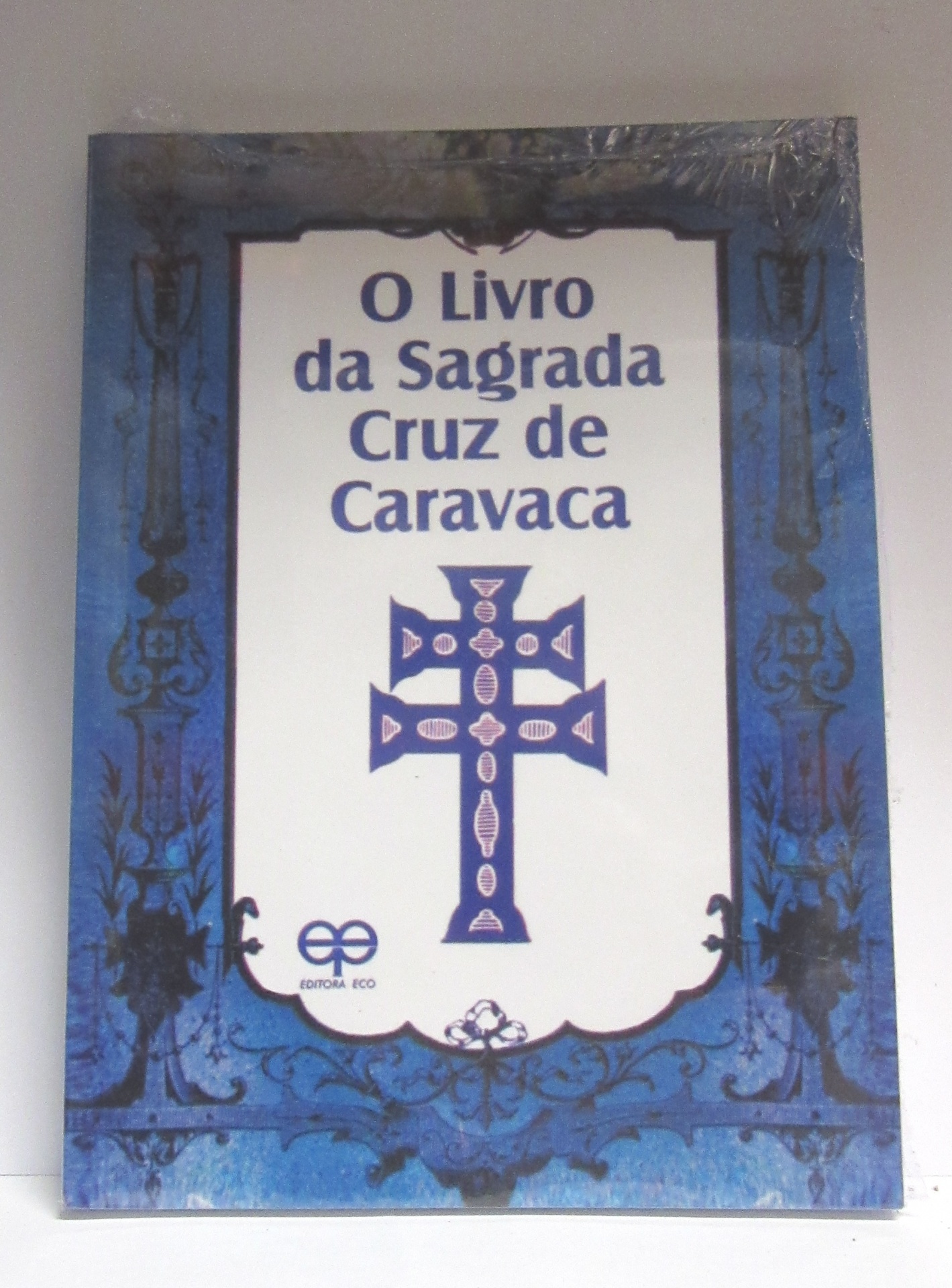 Capa de livro azul com título 'O Livro da Sagrada Cruz de Caravaca' e imagem da Cruz de Caravaca azul no centro