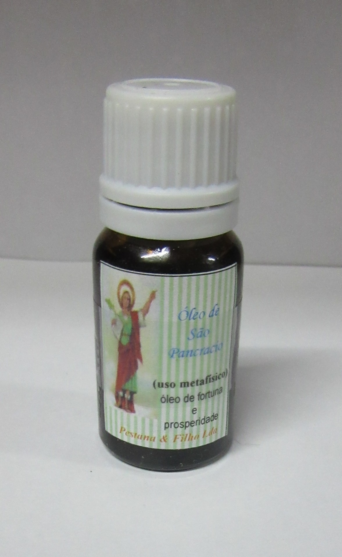 Frasco pequeno de óleo com rótulo de São Pancrácio e tampa branca