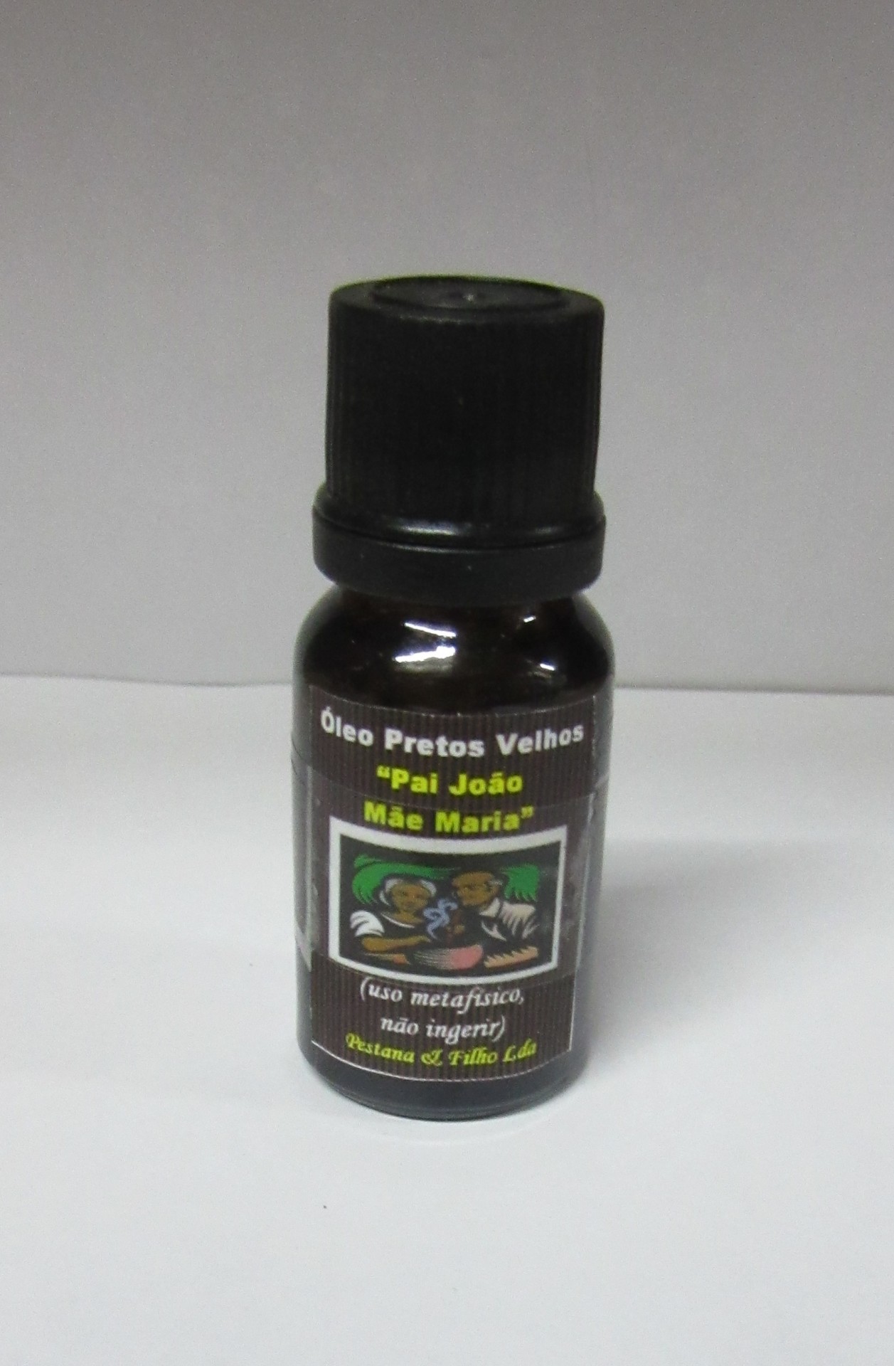 Frasco pequeno de óleo com rótulo 'Pai João Mãe Maria' e tampa preta