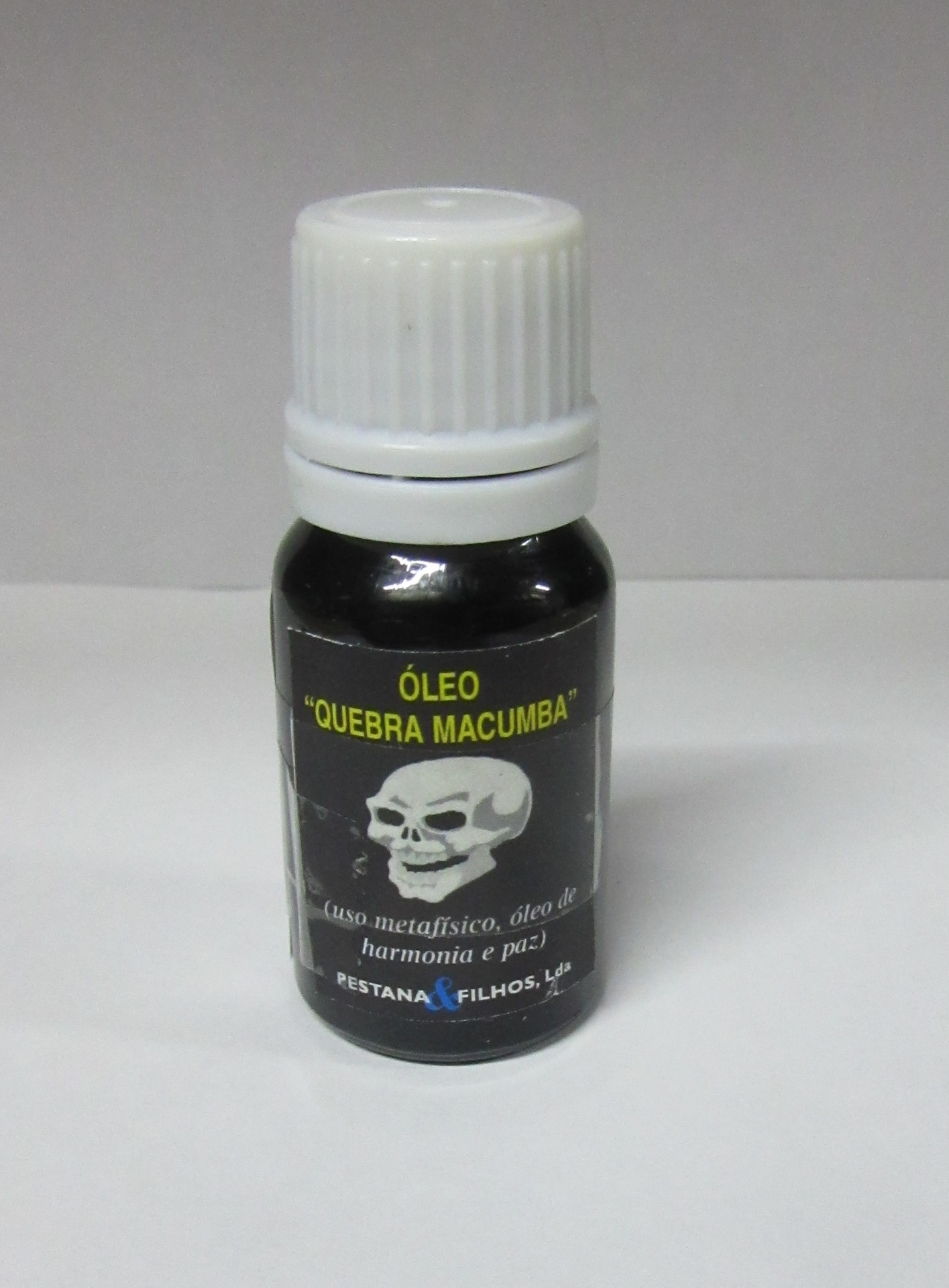 Frasco pequeno de óleo com rótulo preto e tampa branca, com caveira e texto em português.