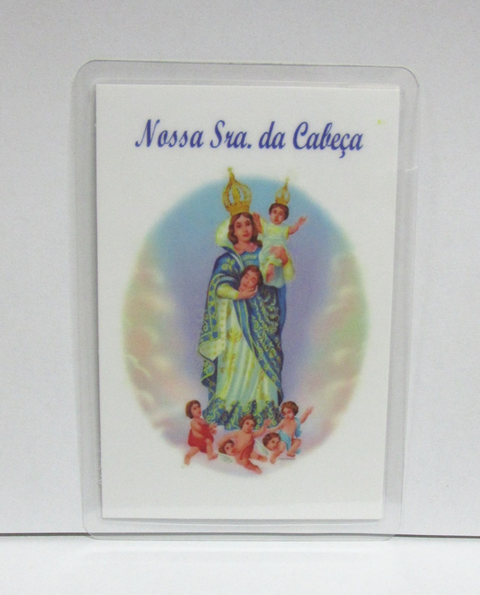 Cartão plástico com imagem religiosa de Nossa Sra. da Cabeça, Nossa Senhora com Menino Jesus e anjinhos, texto azul no topo