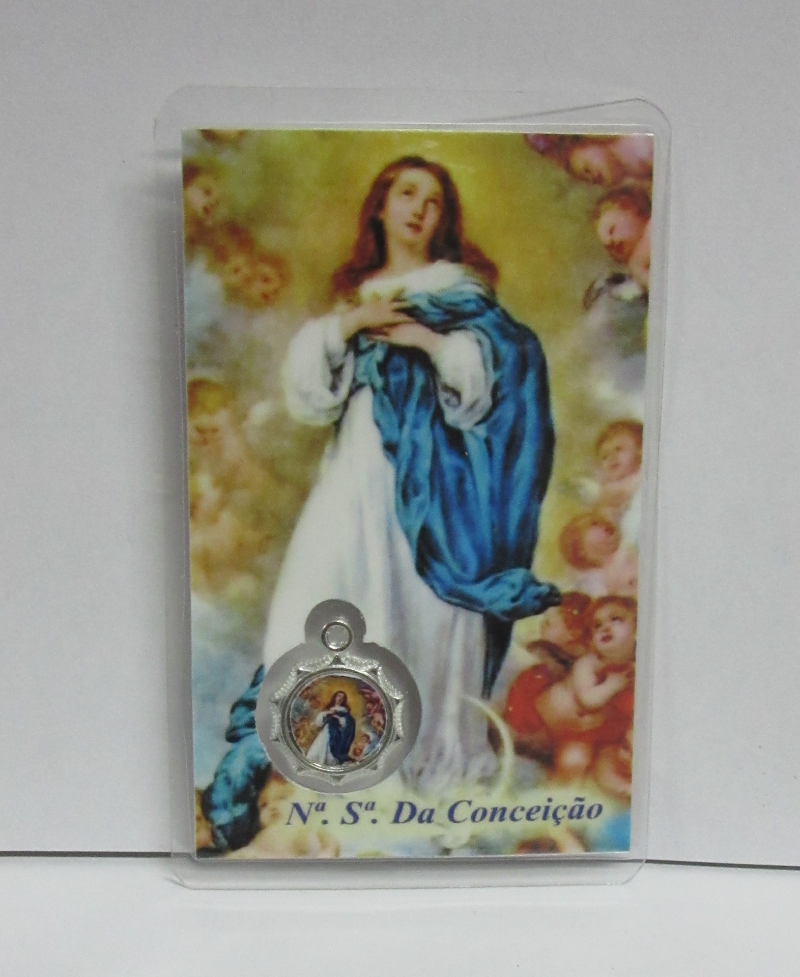 Cartão religioso com imagem de Nossa Senhora da Conceição e medalhão prateado