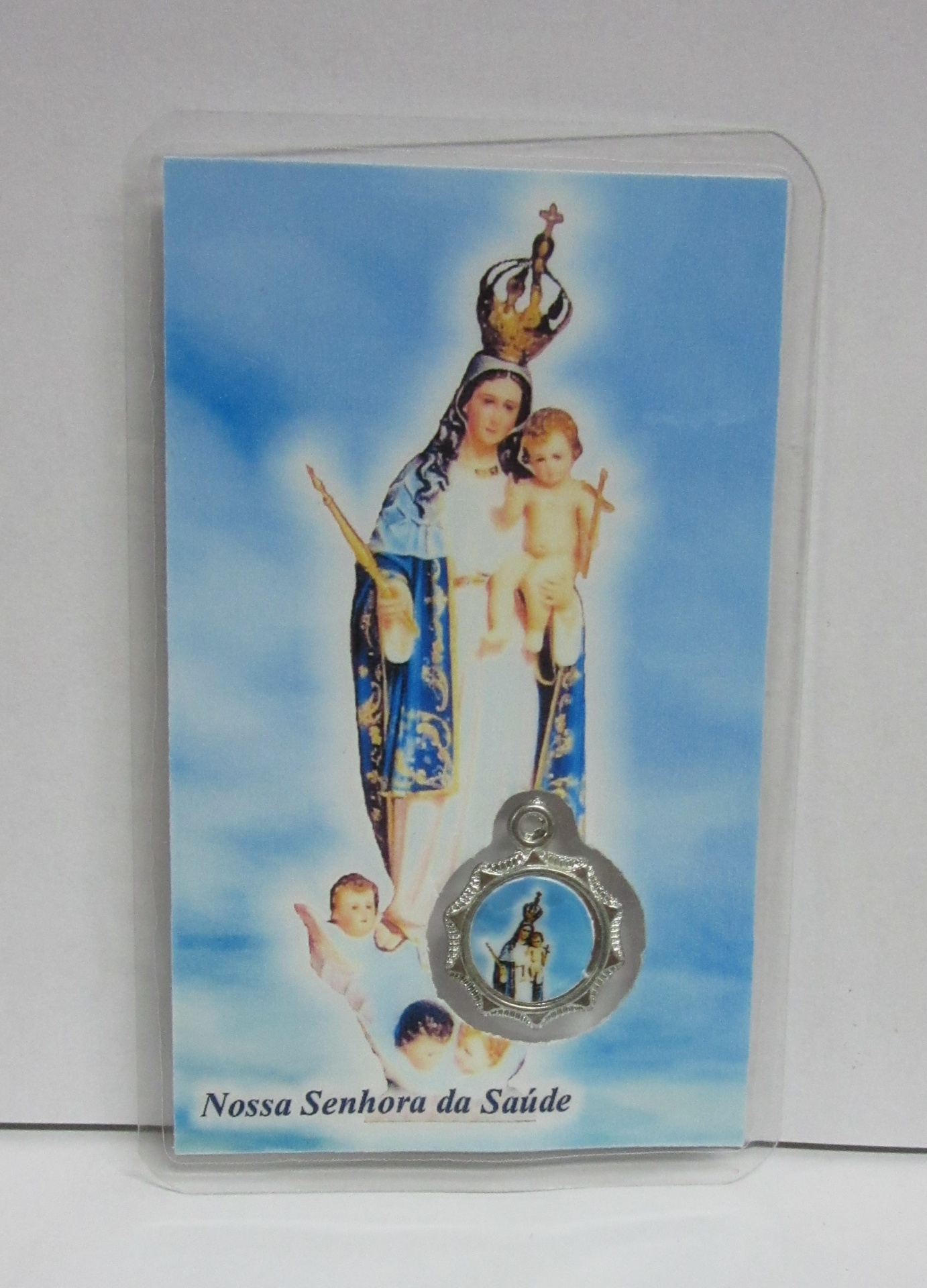 Esta pagela de Nossa Senhora da Saúde é plastificada e contém uma medalha e oração.