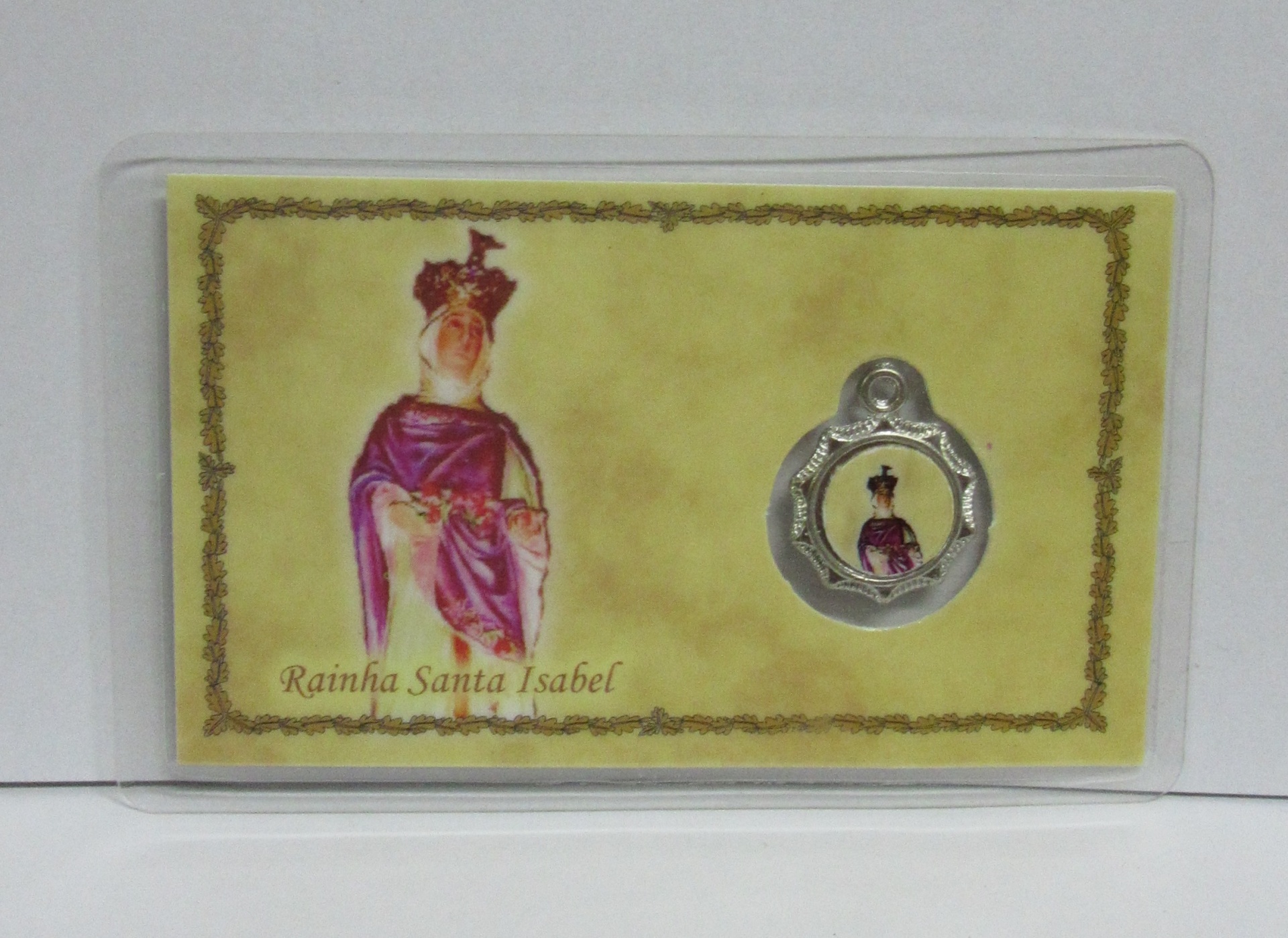 Esta pagela de Rainha Santa Isabel é plastificada e contém uma medalha e oração.